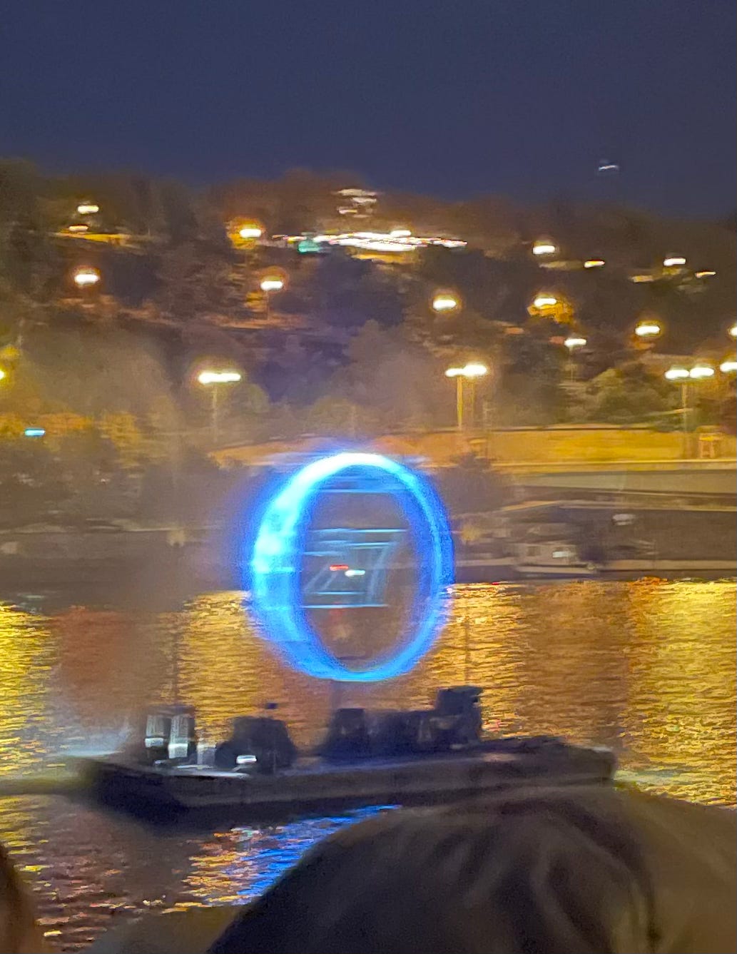 Then came a sound — a deep, pulsing thrum, the city’s heartbeat amplified. Techno shivers of sound bounced off stone walls and rippled through the mist. Ahead, a crowd gathered on the upper river path, pressed against the iron railing. An explosion of light fractured the air. Beams strobed and shifted, carving the fog into shapes of pure energy. From a raft in the river’s centre, a vortex of light began to spin — a black hole, stretching, shrinking, as though breathing. The crowd gasped.